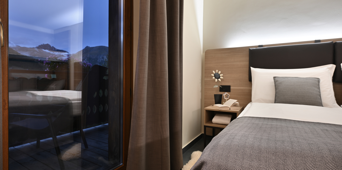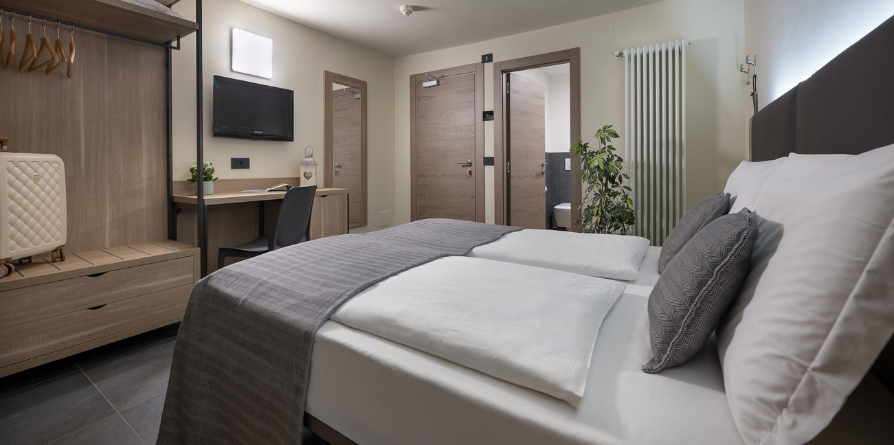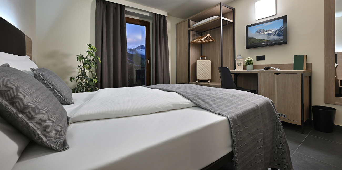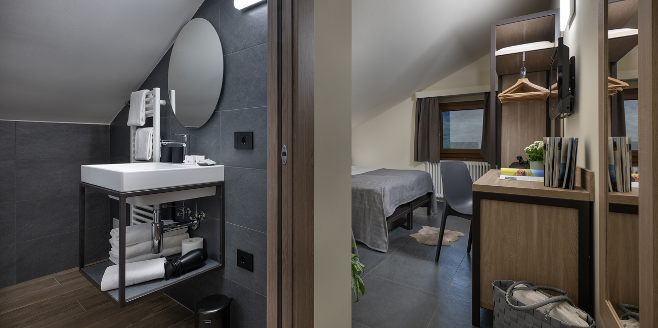 Dieses Zimmer ist mit Holz im modernen Bergstil und Keramikfliesenboden eingerichtet und verfügt über alle Merkmale der Doppelzimmer, mit Doppelbett, Kleiderschrank und eigenem Bad. Es ist für eine Person geeignet.