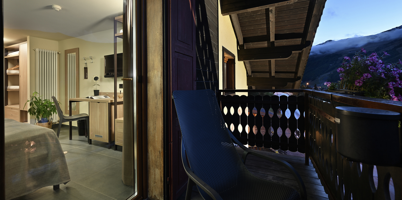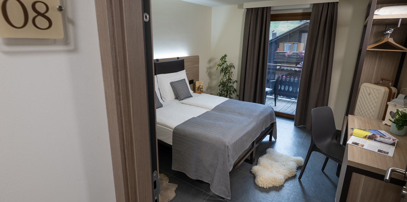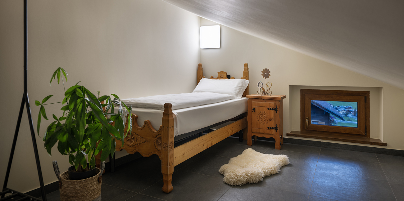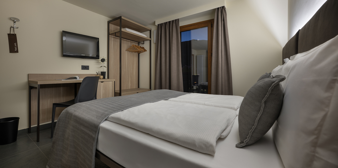 Dieses Zimmer ist mit Holz im modernen Bergstil und Keramikfliesenboden eingerichtet und verfügt über alle Merkmale der Doppelzimmer, mit Doppelbett, Kleiderschrank und eigenem Bad. Es ist für eine Person geeignet.