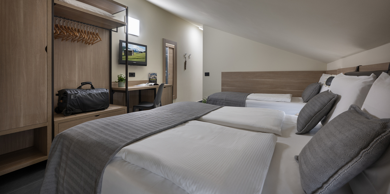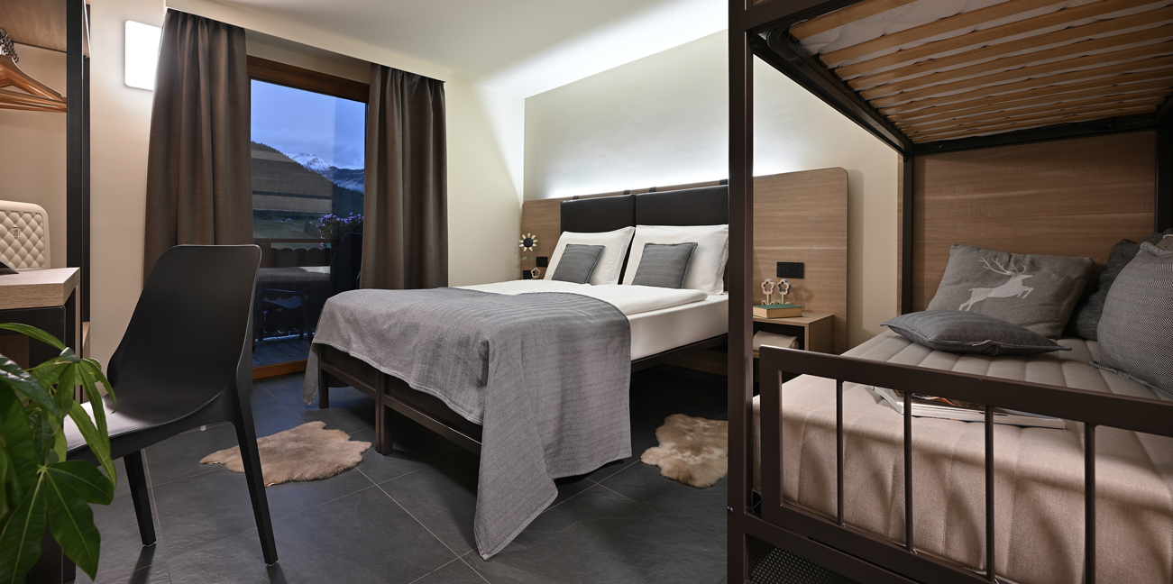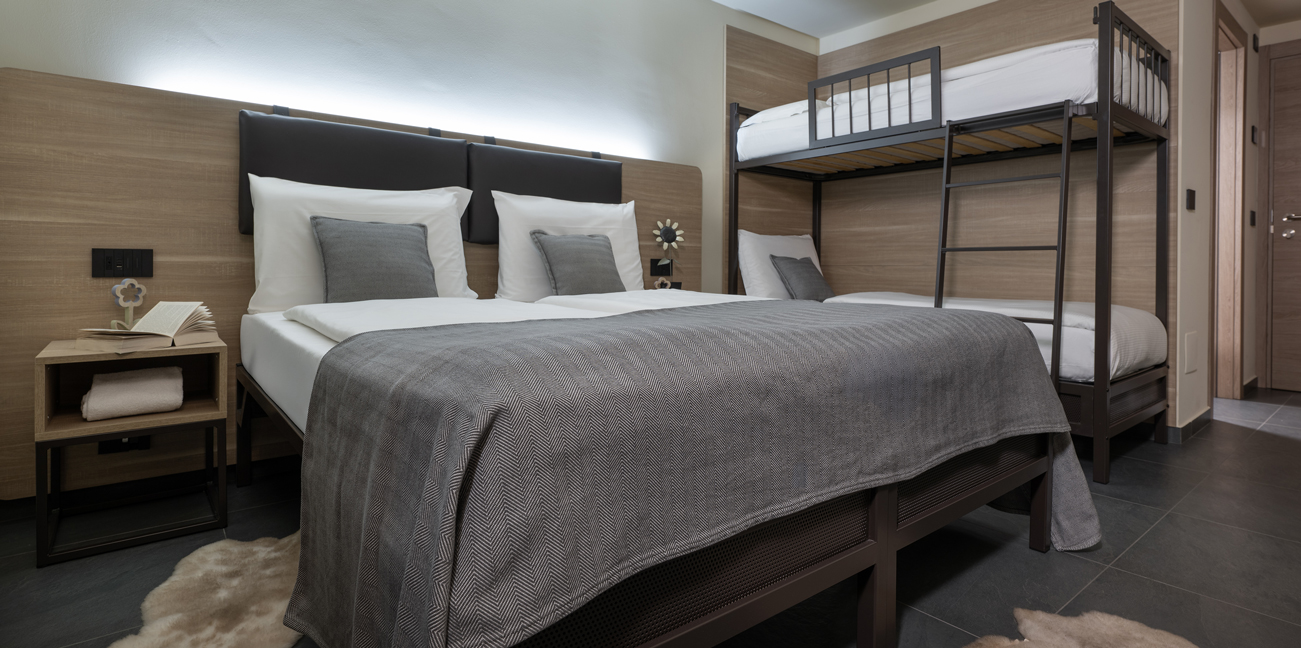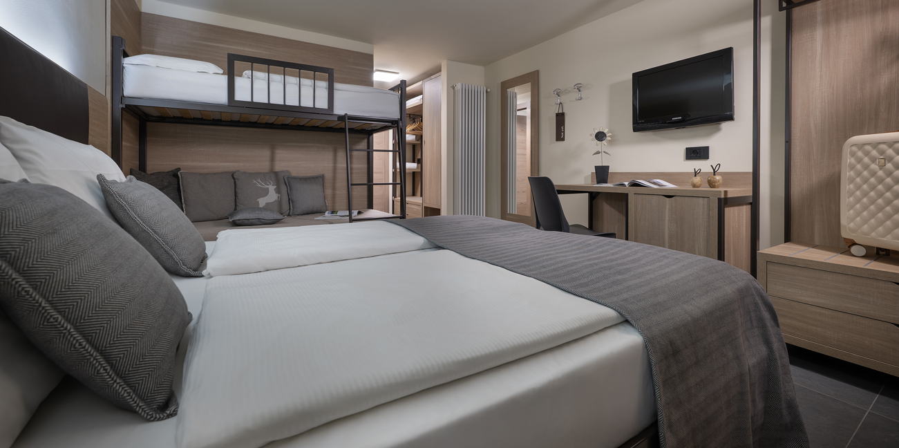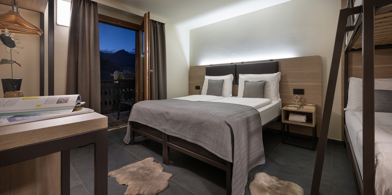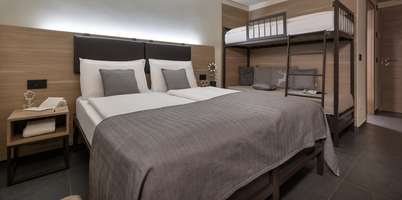 Diese Lösung ist ideal für Familien mit zwei Kindern oder für Gruppen von Freunden. Das Zimmer ist geräumig und mit Liebe zum Detail eingerichtet, mit Holz im modernen Bergstil und Keramikboden, mit einem Doppelbett, zwei Einzelbetten, einem Kleiderschrank und einem eigenen Bad. Auf Anfrage kann hier ein Campingbett für Kinder bis zu zwei Jahren hinzugefügt werden.