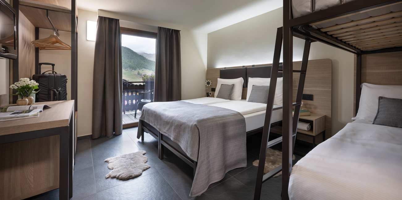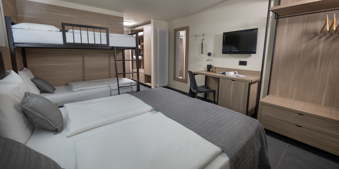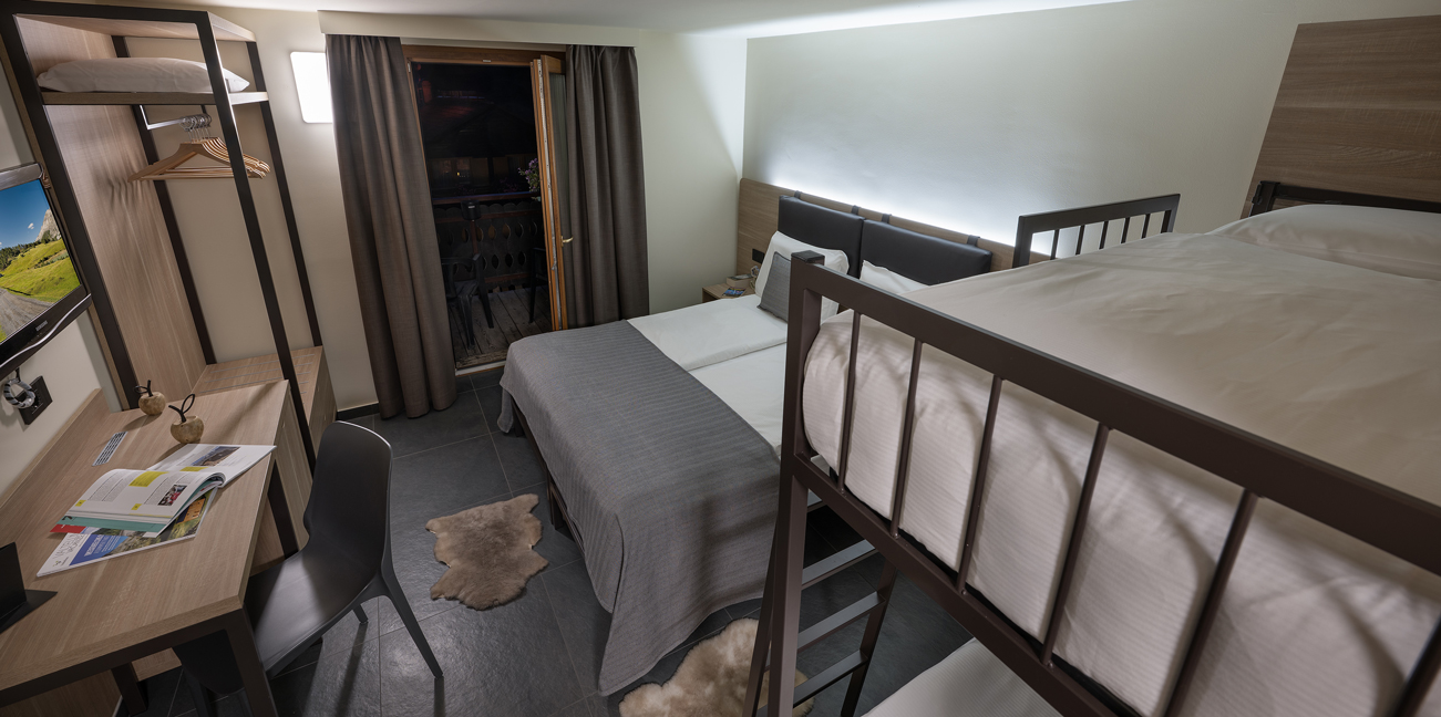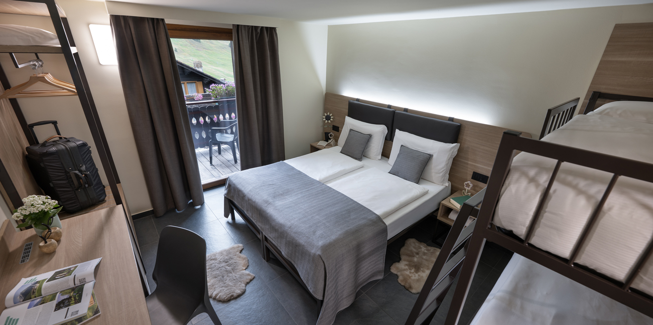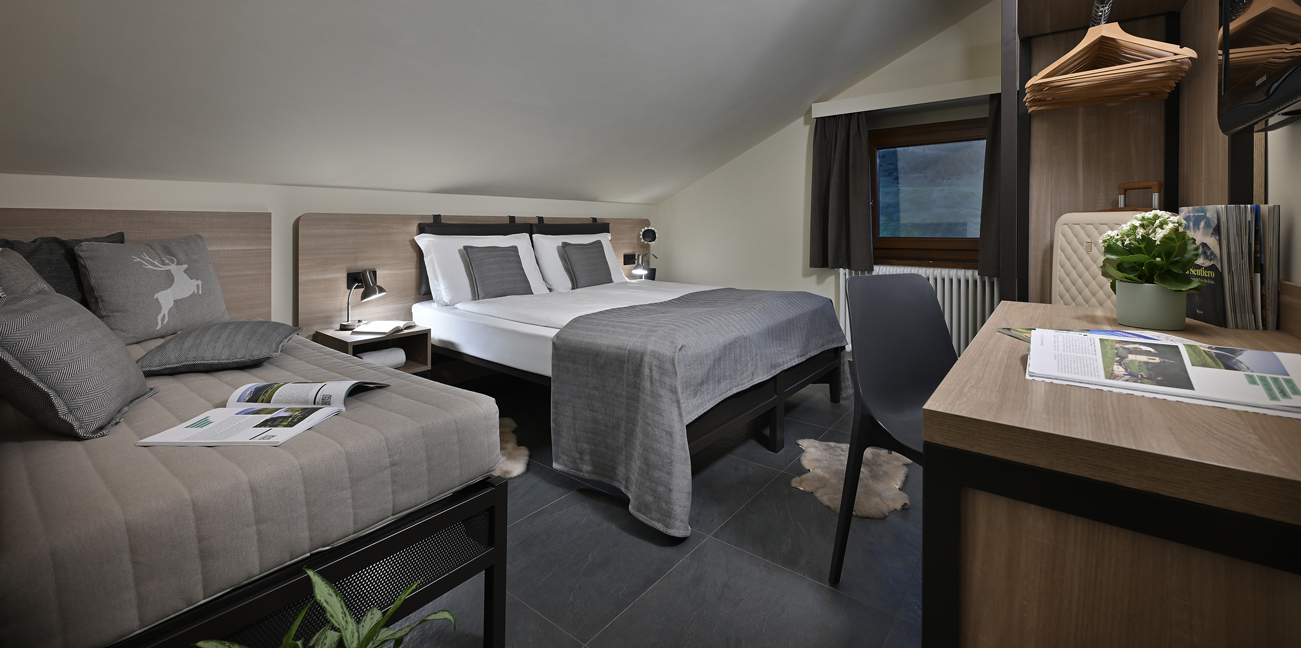 Diese Lösung ist ideal für Familien mit zwei Kindern oder für Gruppen von Freunden. Das Zimmer ist geräumig und mit Liebe zum Detail eingerichtet, mit Holz im modernen Bergstil und Keramikboden, mit einem Doppelbett, zwei Einzelbetten, einem Kleiderschrank und einem eigenen Bad. Auf Anfrage kann hier ein Campingbett für Kinder bis zu zwei Jahren hinzugefügt werden.