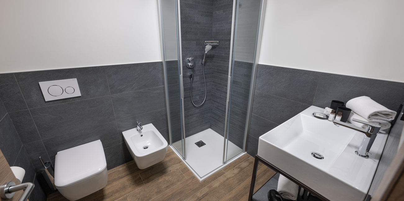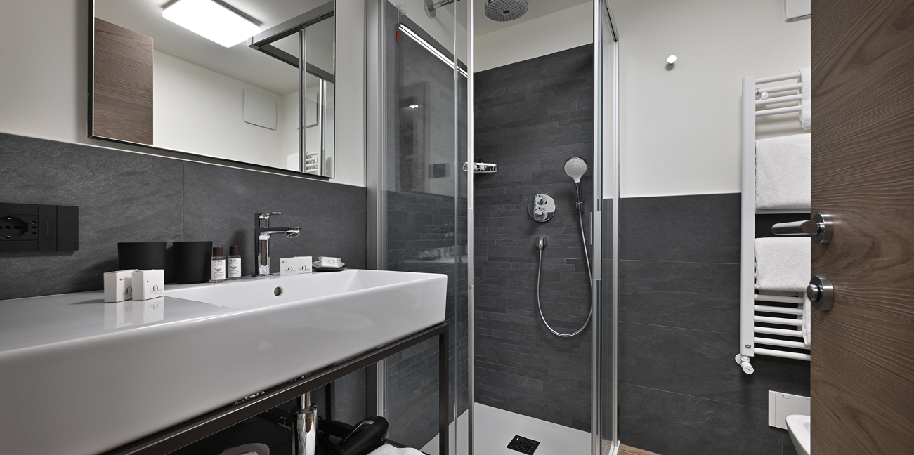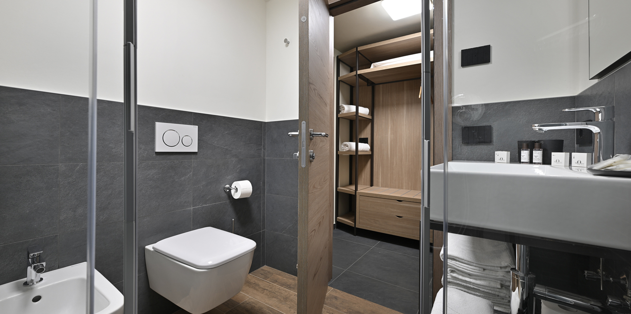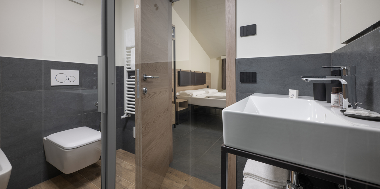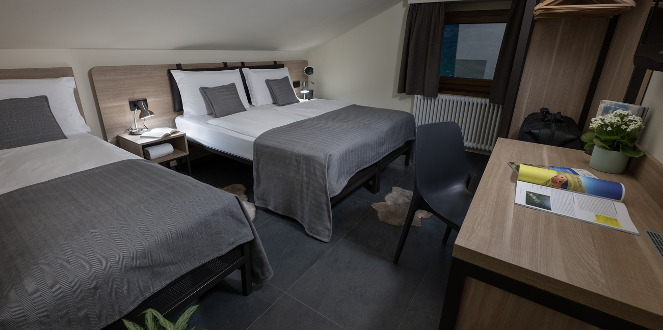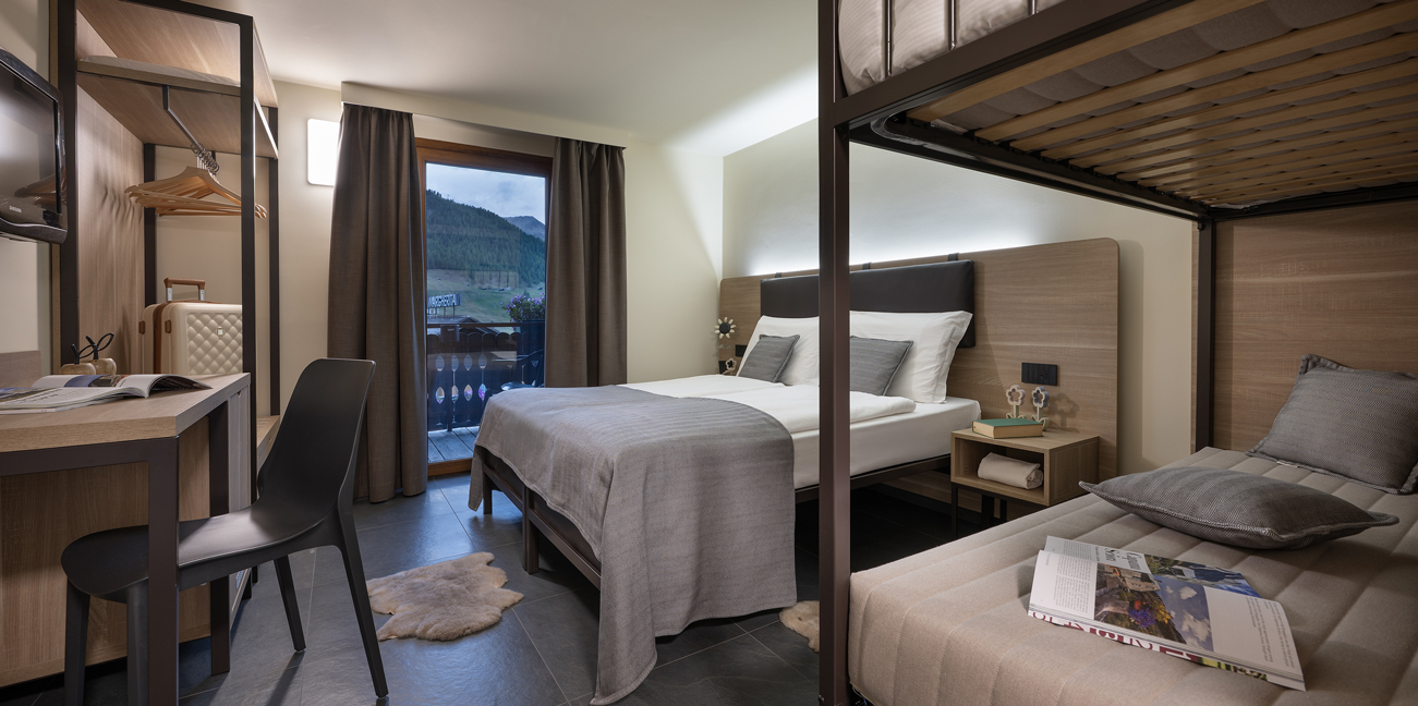 Diese Lösung ist ideal für Familien mit zwei Kindern oder für Gruppen von Freunden. Das Zimmer ist geräumig und mit Liebe zum Detail eingerichtet, mit Holz im modernen Bergstil und Keramikboden, mit einem Doppelbett, zwei Einzelbetten, einem Kleiderschrank und einem eigenen Bad. Auf Anfrage kann hier ein Campingbett für Kinder bis zu zwei Jahren hinzugefügt werden.
