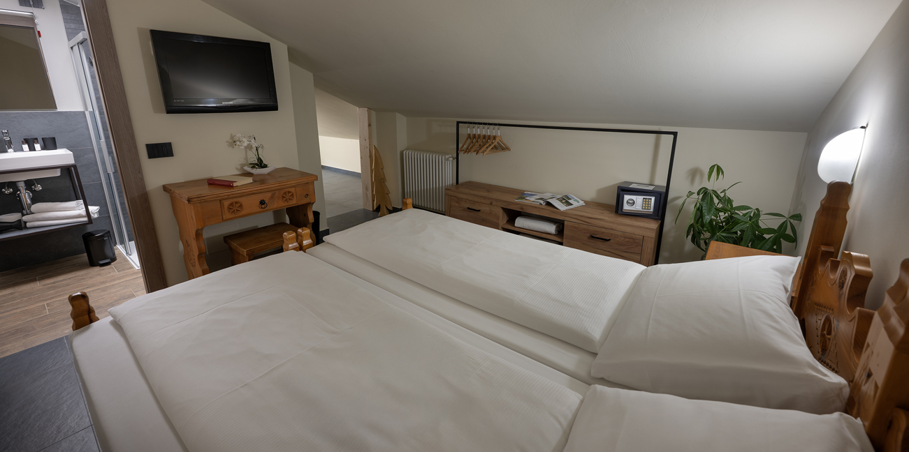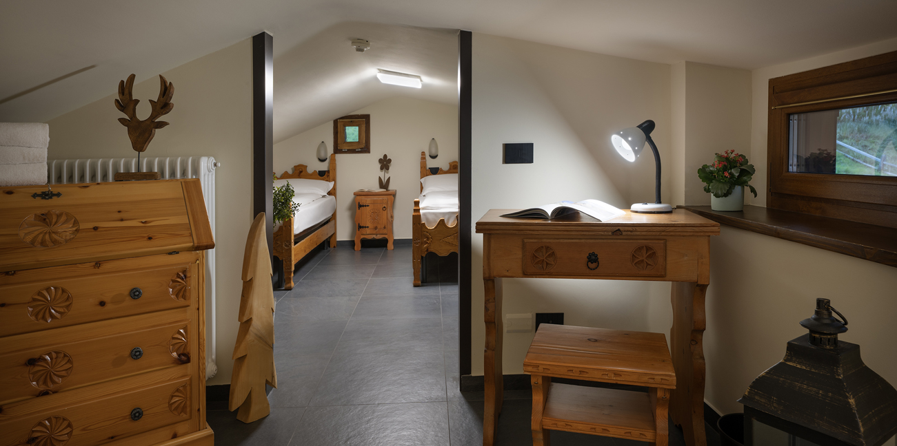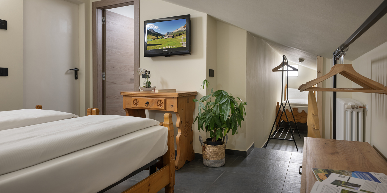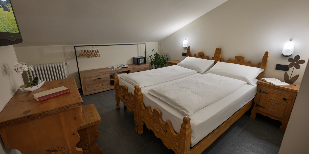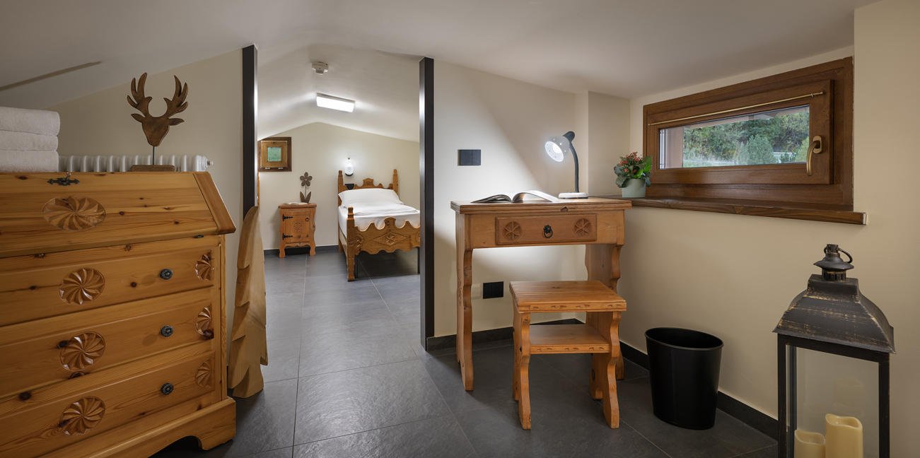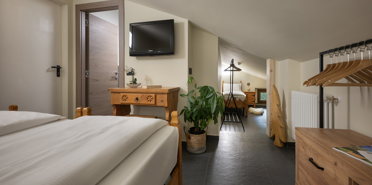 SWenn Sie mit Ihrer Familie oder einer Gruppe von Freunden reisen, ist dieses Zimmer die ideale Lösung. Das Zimmer ist mit Sorgfalt und Liebe zum Detail eingerichtet, mit Holz im modernen Bergstil und Keramikboden, mit einem Doppelbett, einem Einzelbett, einem Kleiderschrank und einem eigenen Bad. Auf Anfrage kann hier ein Campingbett für Kinder bis zu zwei Jahren hinzugefügt werden.