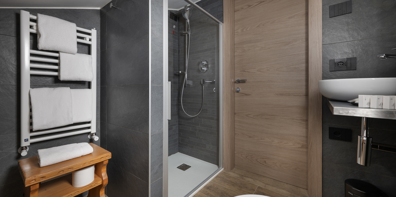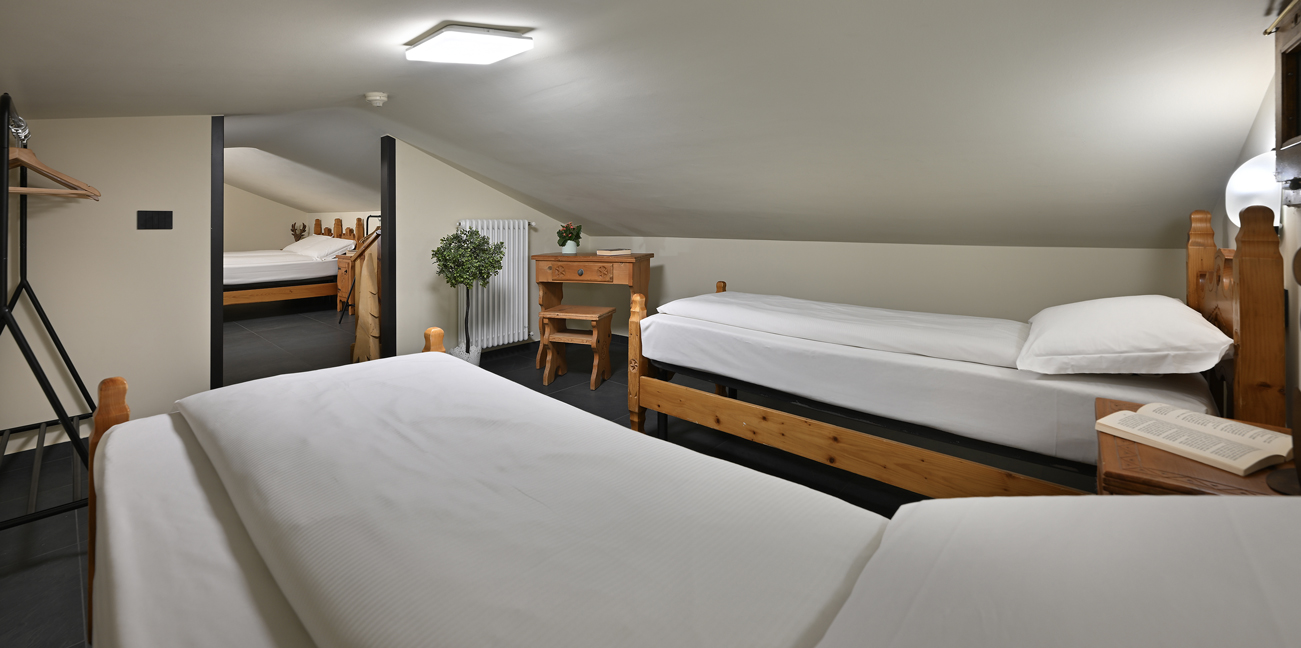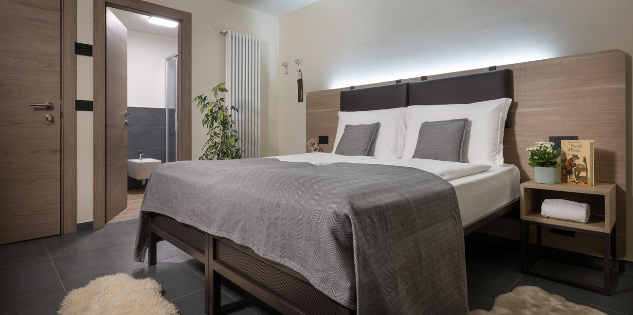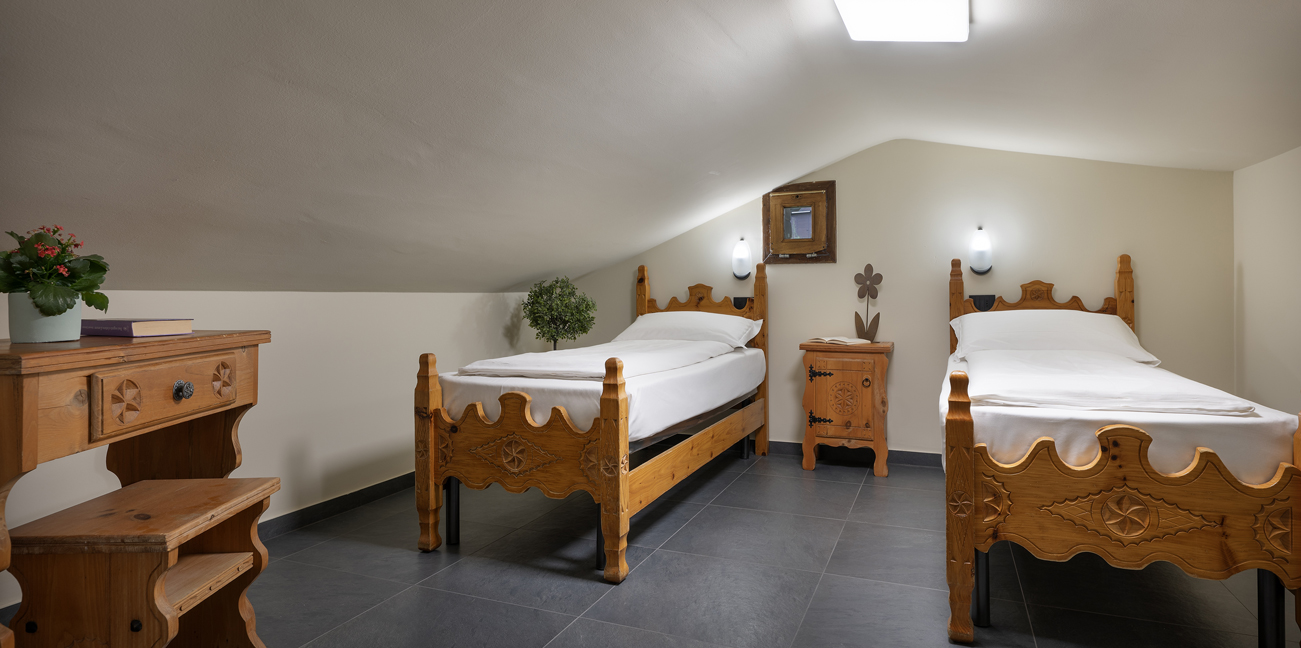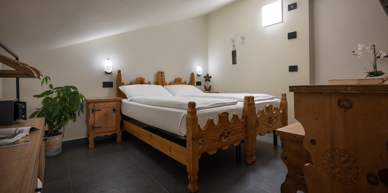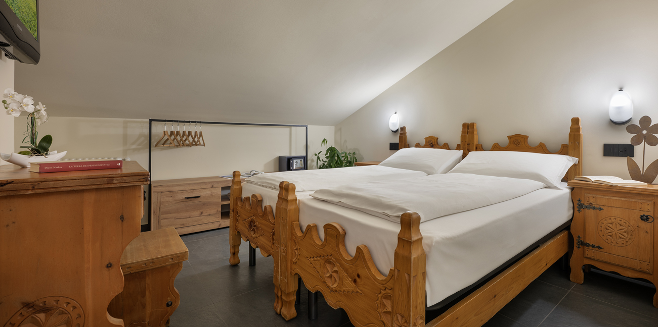SWenn Sie mit Ihrer Familie oder einer Gruppe von Freunden reisen, ist dieses Zimmer die ideale Lösung. Das Zimmer ist mit Sorgfalt und Liebe zum Detail eingerichtet, mit Holz im modernen Bergstil und Keramikboden, mit einem Doppelbett, einem Einzelbett, einem Kleiderschrank und einem eigenen Bad. Auf Anfrage kann hier ein Campingbett für Kinder bis zu zwei Jahren hinzugefügt werden.