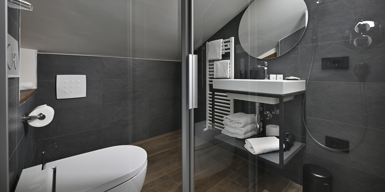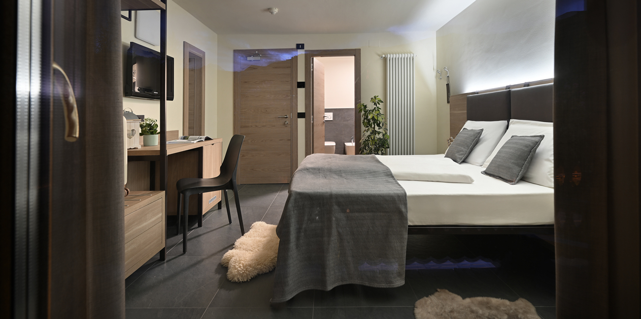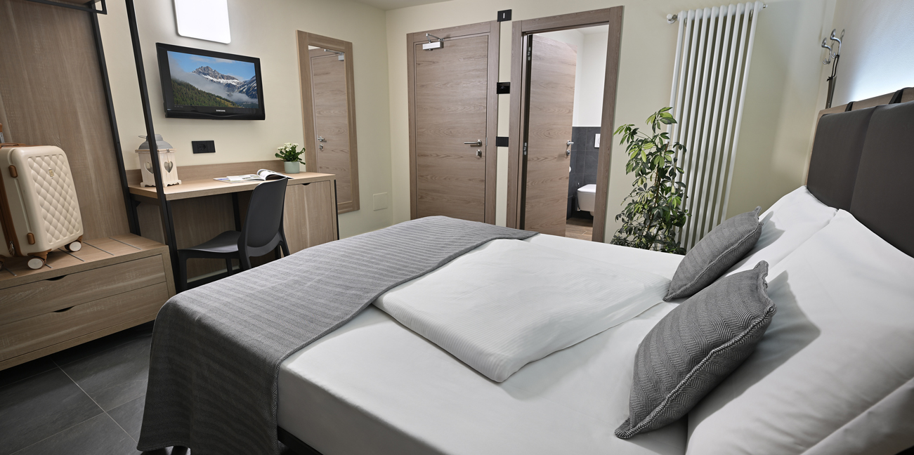 ADieses Zimmer ist mit Sorgfalt und Liebe zum Detail eingerichtet, mit Holz im modernen Bergstil und Keramikboden, mit Doppelbett, Kleiderschrank und eigenem Bad. Es ist sicherlich die ideale Lösung für ein Paar, das einen angenehmen romantischen Urlaub in Livigno verbringen möchte! Auf Anfrage kann hier ein Campingbett für Kinder bis zu zwei Jahren hinzugefügt werden.